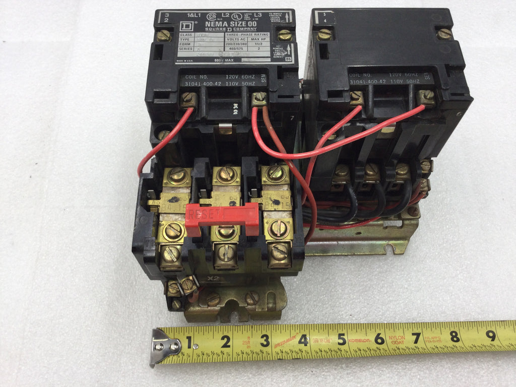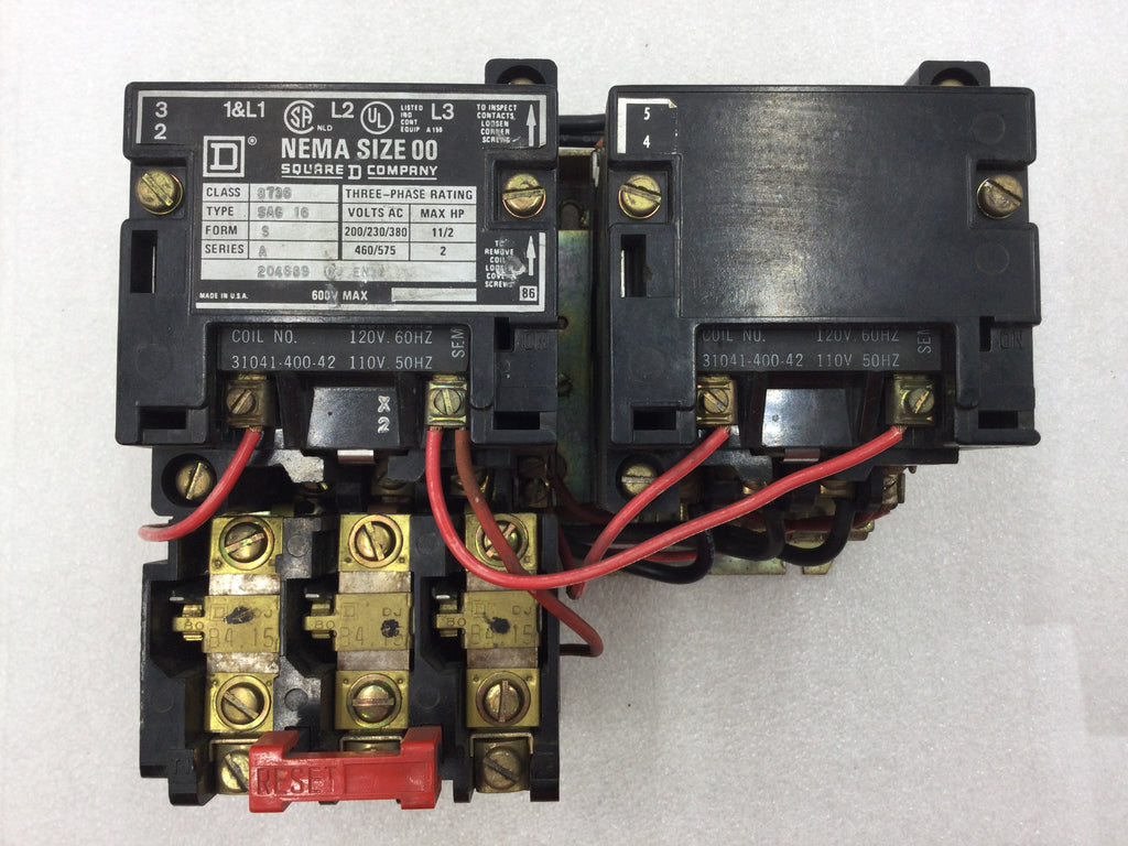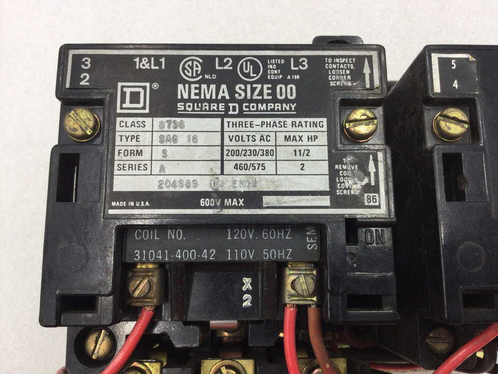 Square D 8736 SAG16 Nema Size 00 Series A Reversing Starter/Contactor 3 Phase 200-575 VAC 1 1/2 to 2 HP with 120 VAC Coil