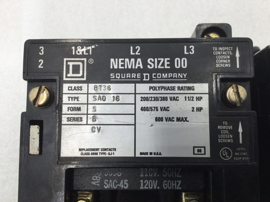 The Square D 8736 SA016 Nema Size 00 Series B Reversing Starter/Contactor is a versatile and durable 3-phase starter with a 120 VAC coil, suitable for a wide range of voltage inputs (200-575 VAC). Its compact Nema Size 00 design offers high performance and convenience, making it an essential component for any industrial setting.
