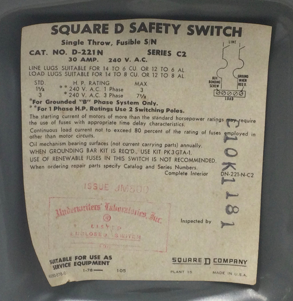 Square D D221N 30 Amp 2 Pole 120/240V Fusible Safety Switch
