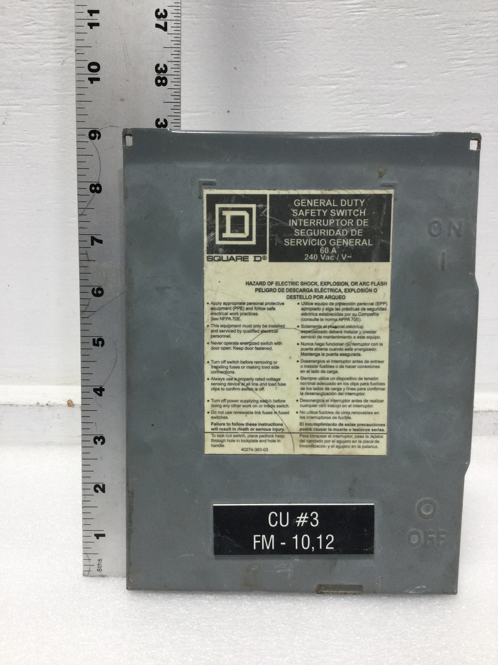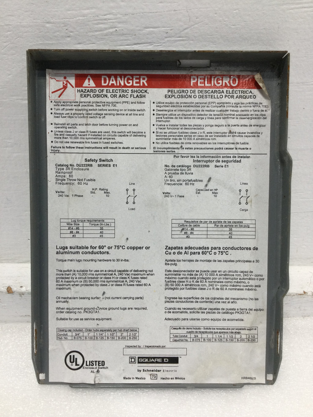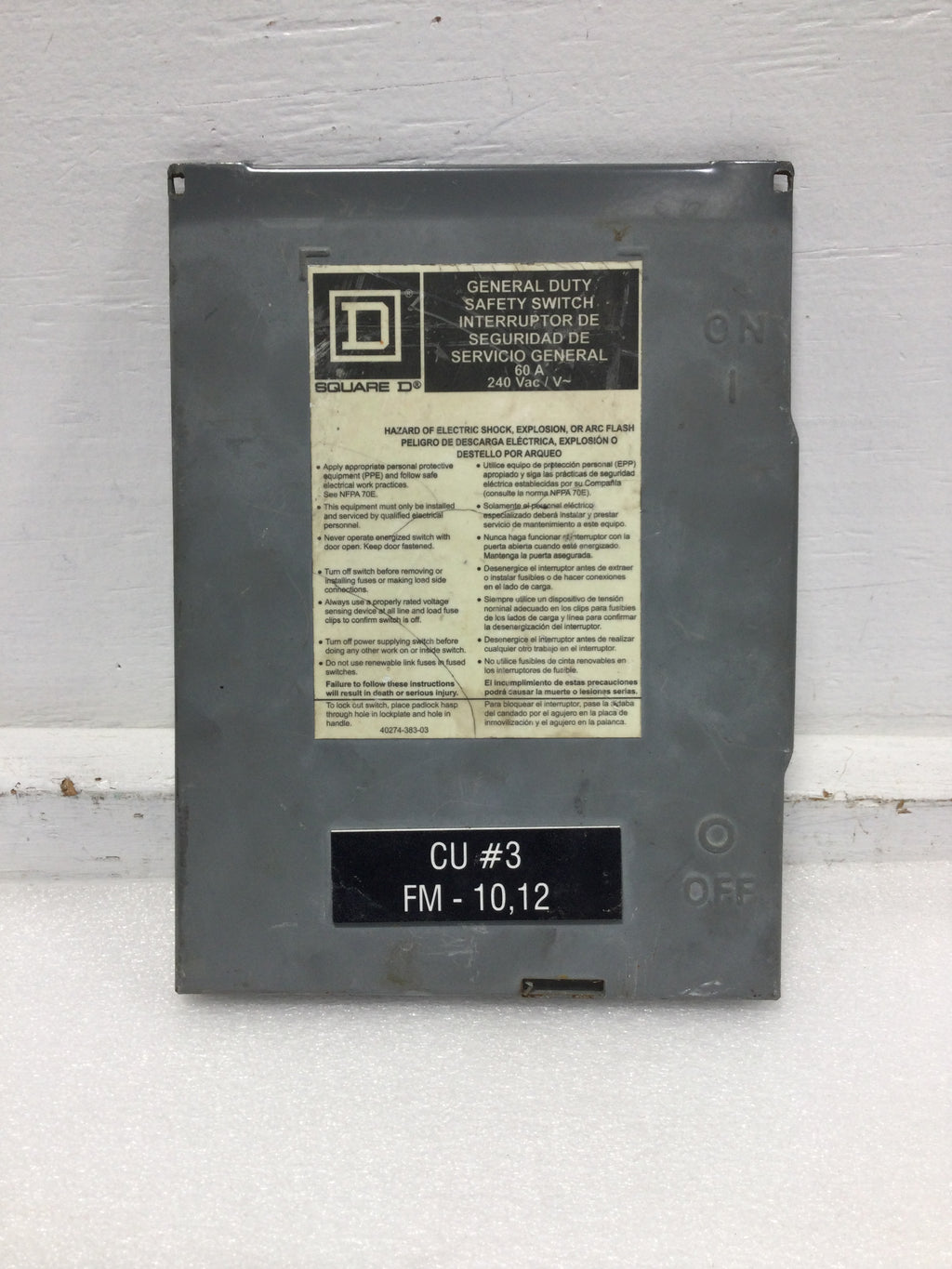 Square D DU222RB 60 Amp 240V Disconnect Cover Only 9" x 6 5/8"