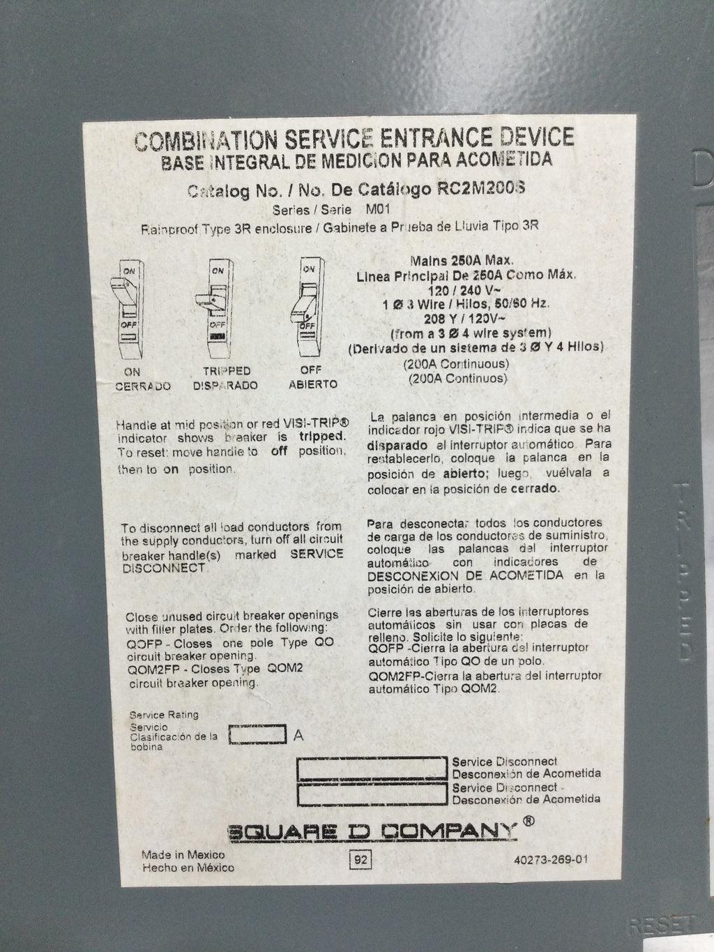 Square D RC2M200S 250 Amp 120/240V Dead Front Only 18" x 9 3/4"