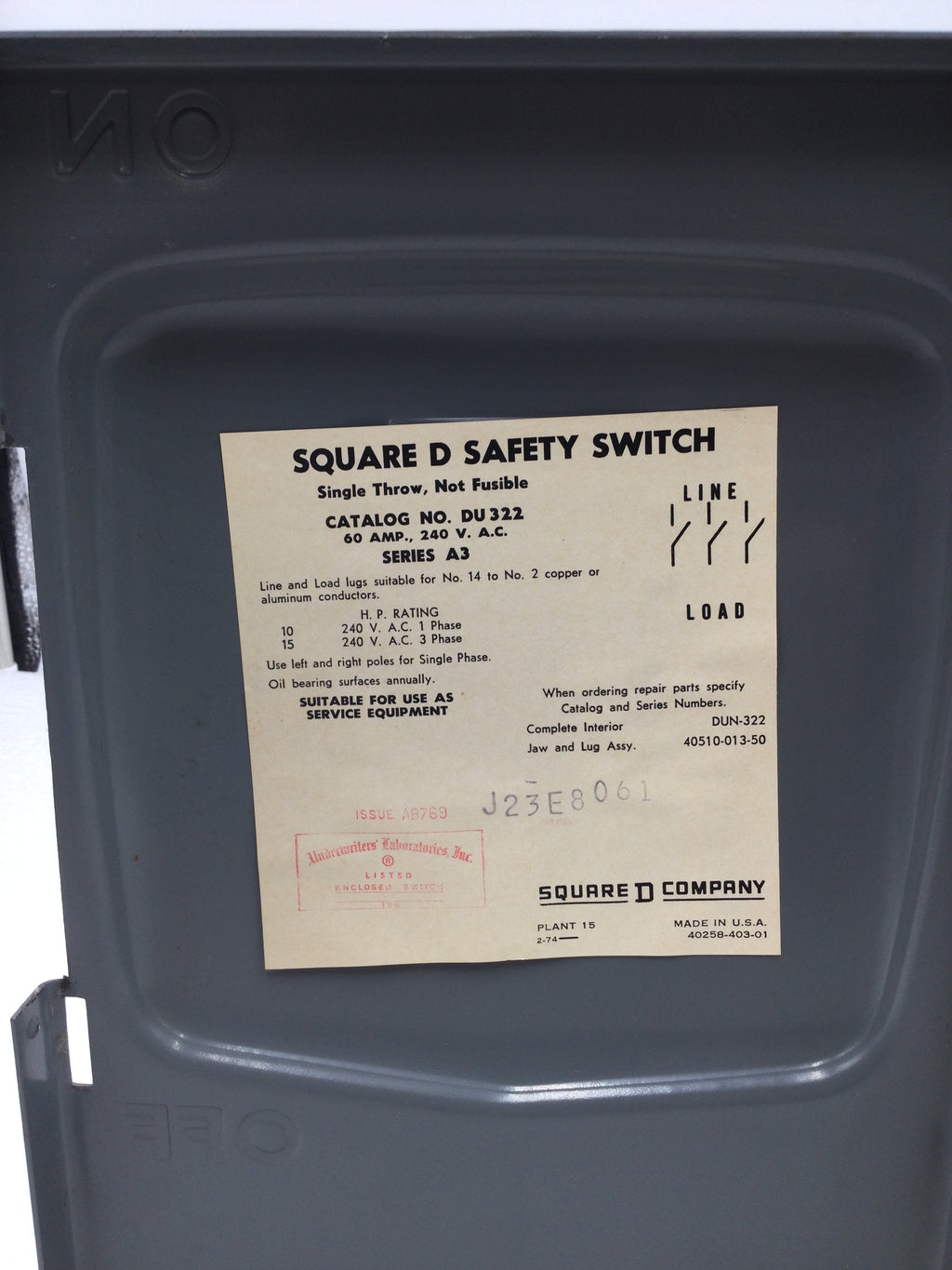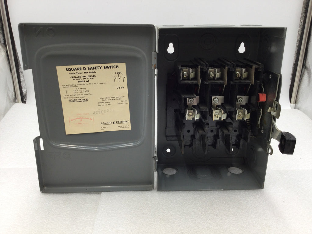This Square D DU322 safety switch is designed for 3-phase electrical systems with a maximum capacity of 60 amps and 240 volts. It features a non-fused design and is rated for Nema 1 applications. Ensure safety and efficiency with this reliable and durable safety switch.