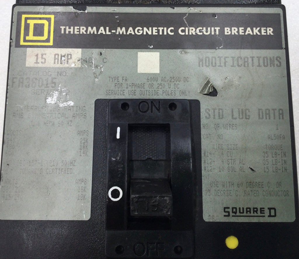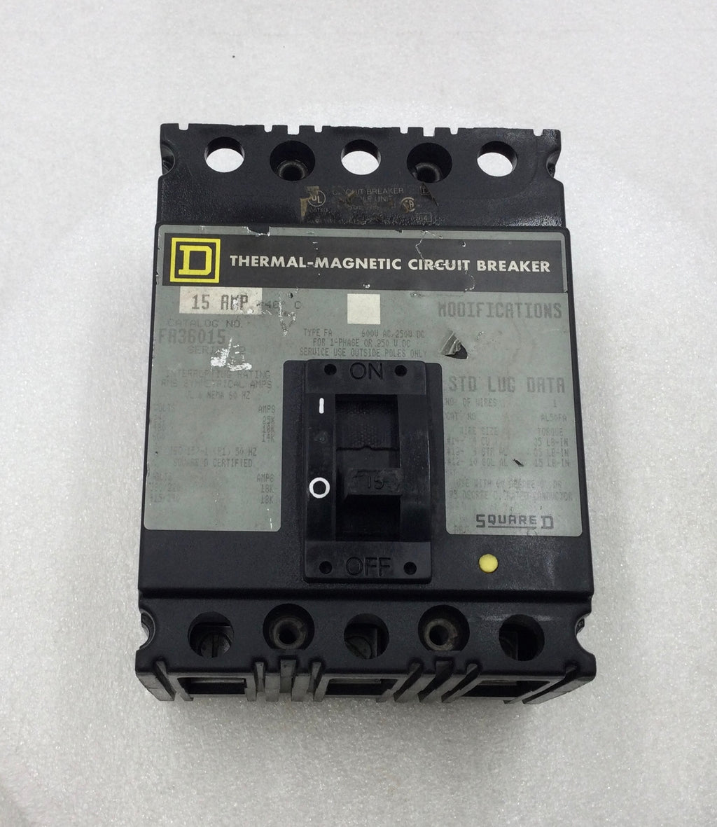 Square D FA36015 15 Amp 3 Pole 600V Circuit Breaker FA-36015