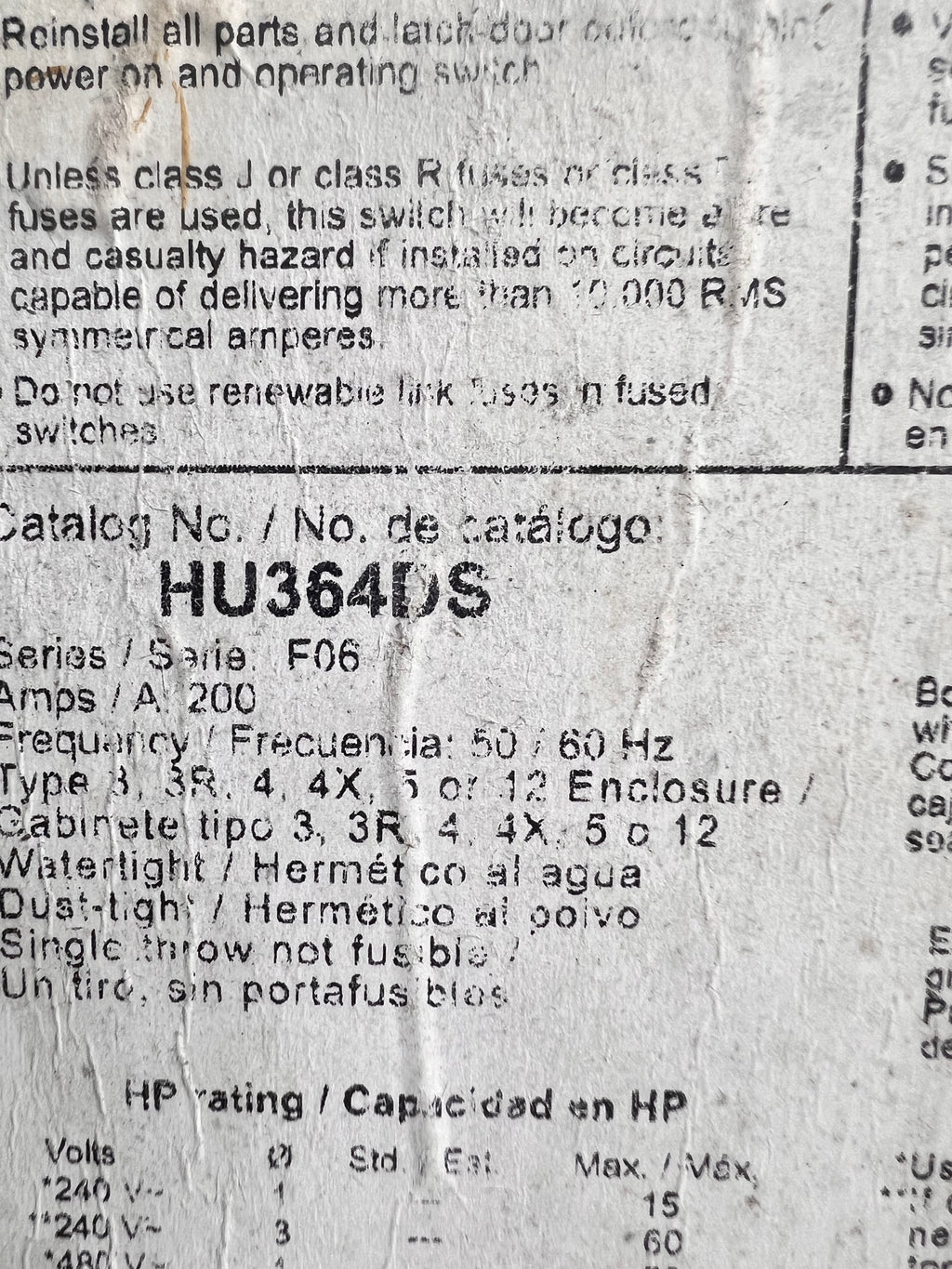 Square D HU364DS Heavy Duty Stainless Steel Non-Fusible Safety Switch 200 Amp 600V 3Ph NEMA 3R