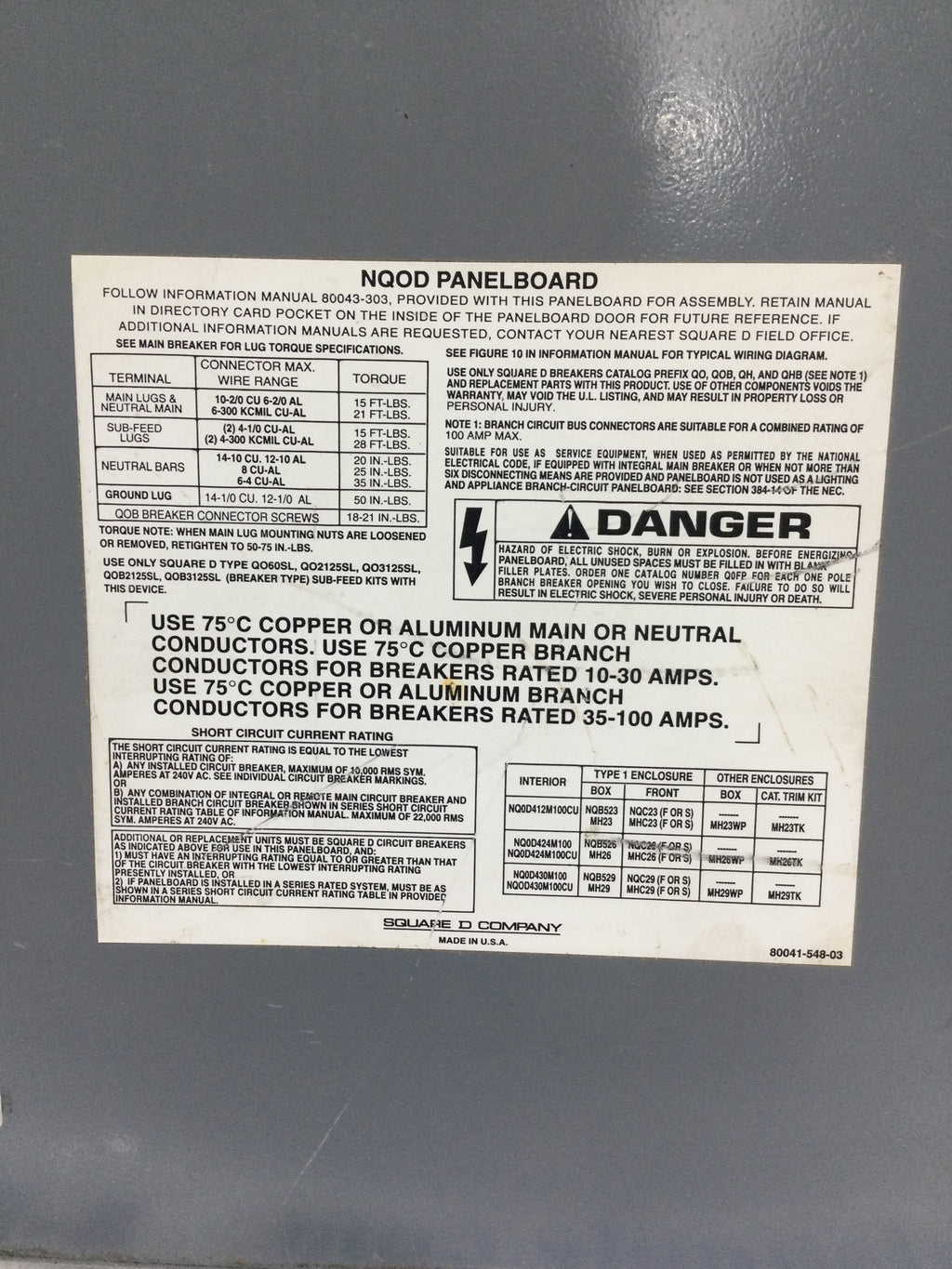 Square D NQOD430M100CU 100 Amp 30 Space 120/240V Dead Front w/Main 24" x 9 5/8"