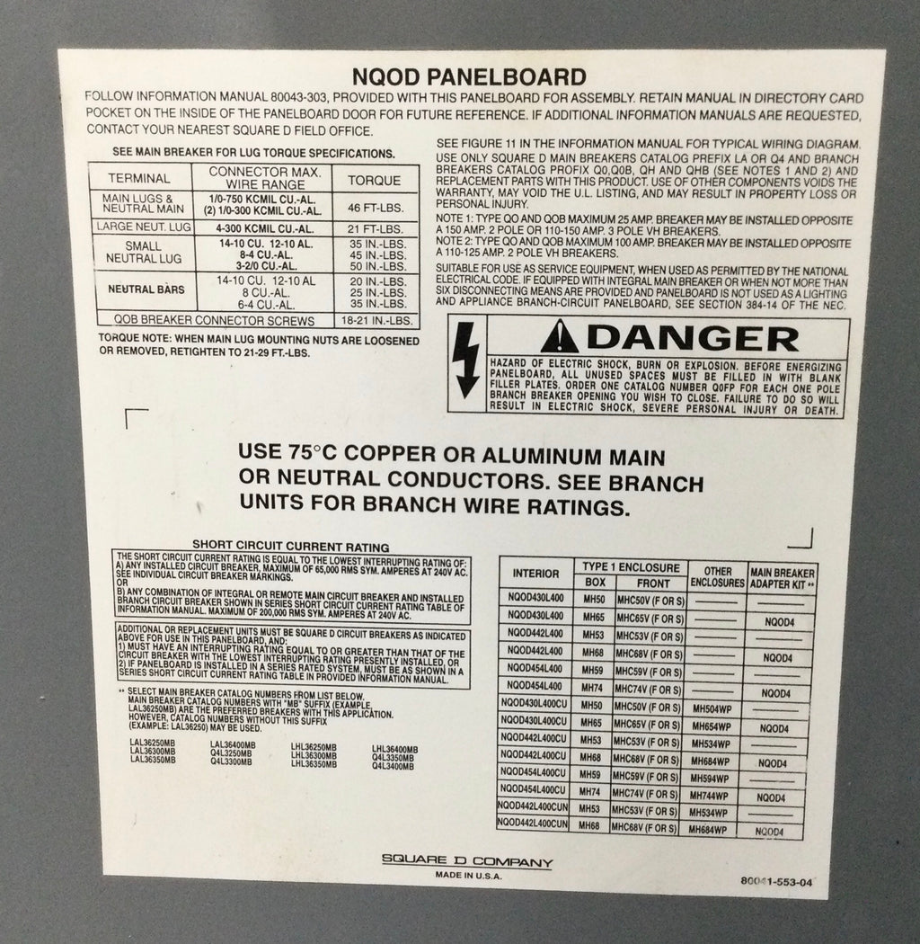 The Square D NQOD442L400 is a 400 Amp, 3-Phase, 240Volt Panelboard that offers reliable and efficient power distribution. Its sturdy construction and high amperage capacity make it ideal for commercial and industrial use. Count on Square D for safe and reliable electrical equipment.