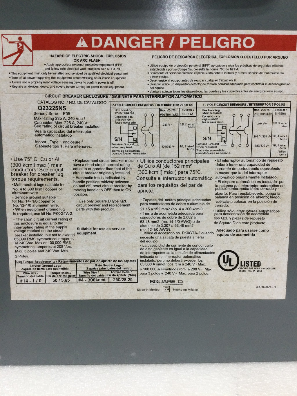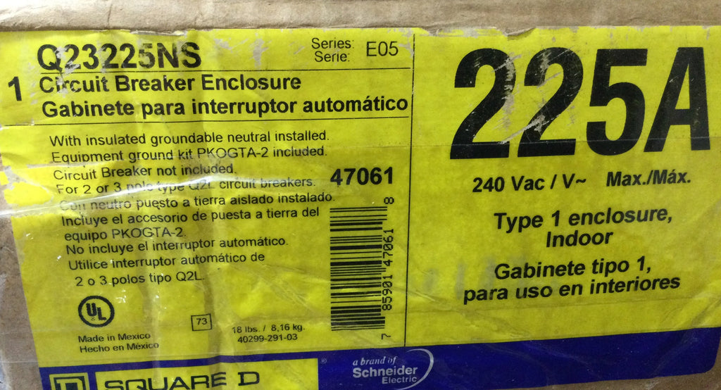 Square D Q23225NS 225 Amp 120/240VAC Type Nema1 Circuit Breaker Enclosure