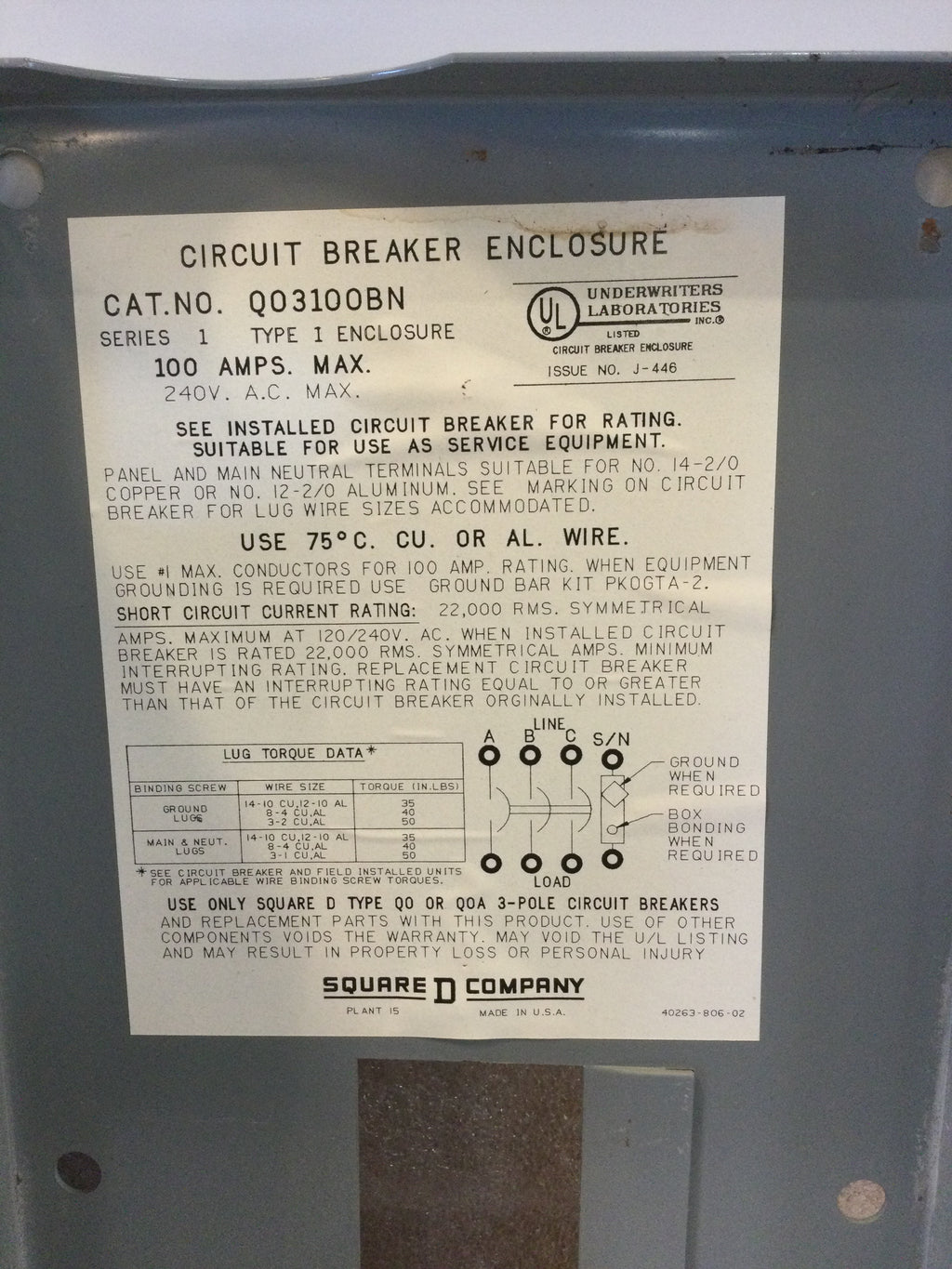 Square D QO3100BN 100 Amp 240V Type 1 Enclosure 13" x 6"