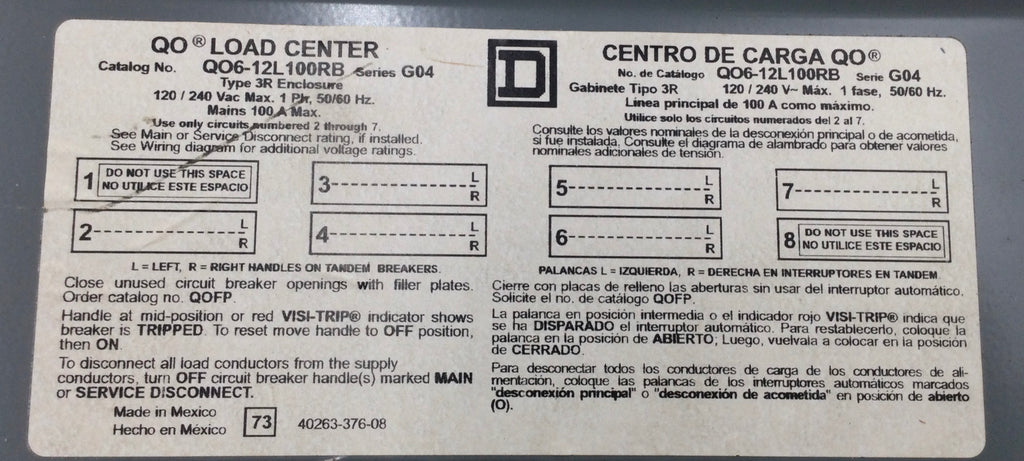 Square D QO6-12L100RB 100 Amp 1-Phase 240V Breaker-Disconnect
