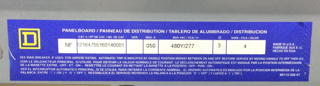 Square D Type NF 12164755160140001 50 Amp 30 Circuit 3 Phase 480Y/277 VAC Panel Board