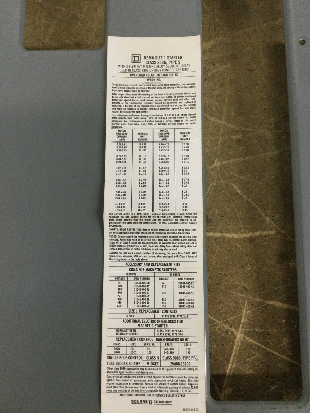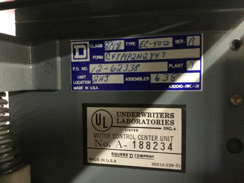 Square D Y47 Breaker Bucket Box 480 Volt 3 Phase Class 8998 Type EC402 Series B 15" X 17"