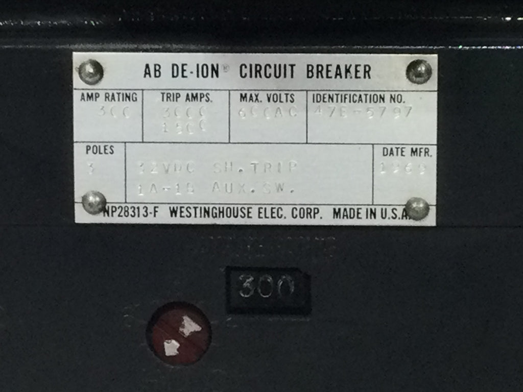 Westinghouse 47E-5797 300 Amp 3 Pole 600V Circuit Breaker w/Aux Switch