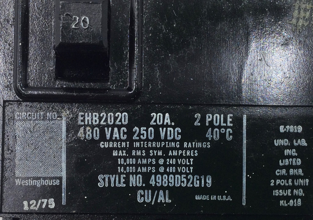Westinghouse EHB2020 20 Amp 2 Pole 480V Circuit Breaker - Cosmetic Flaw