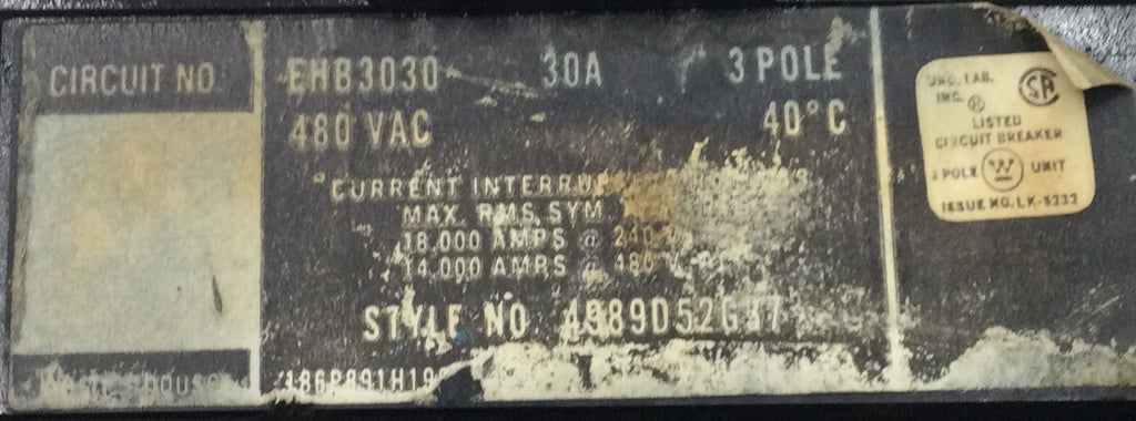 Westinghouse EHB3030 30 Amp 3 Pole 480V Circuit Breaker - Cosmetic Flaw