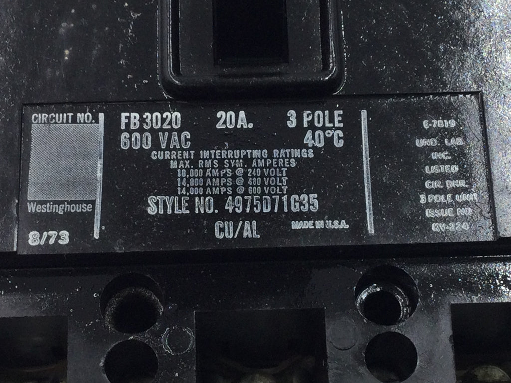 Westinghouse FB3020 20 Amp 3 Pole 600V Circuit Breaker - Cosmetic Flaw