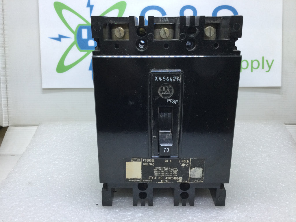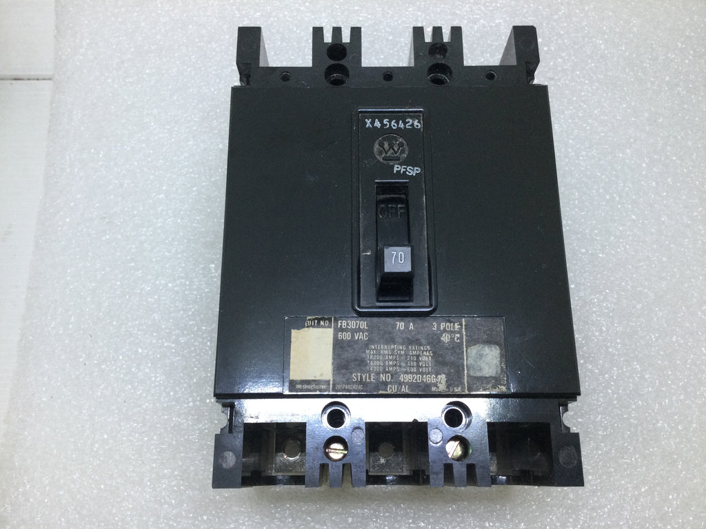 This Westinghouse FB3070L circuit breaker has a high amperage rating of 70 amps and a 3 pole design for optimal performance. It is rated for up to 600Vac, making it suitable for a wide range of applications. The FB3070L is a reliable choice for any circuit protection needs.