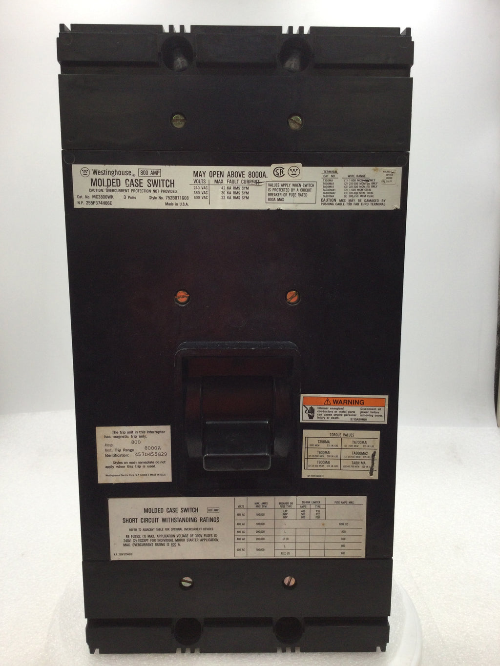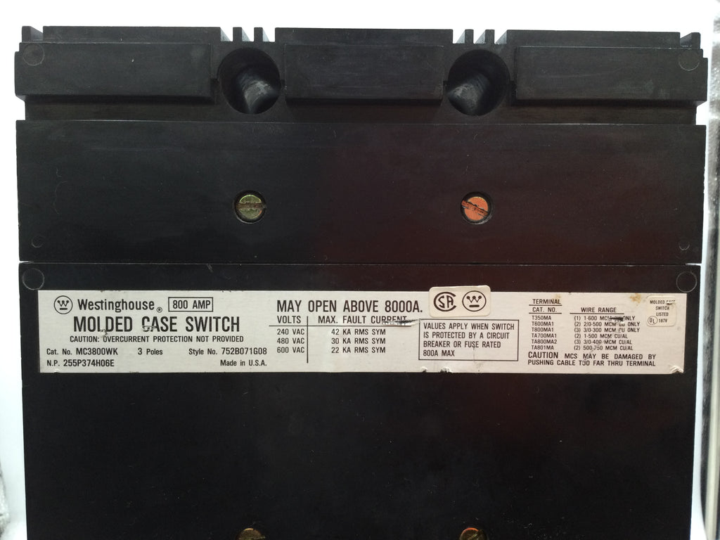 Westinghouse MC3800WK 800 Amp 3 Pole 600v Molded Case Switch