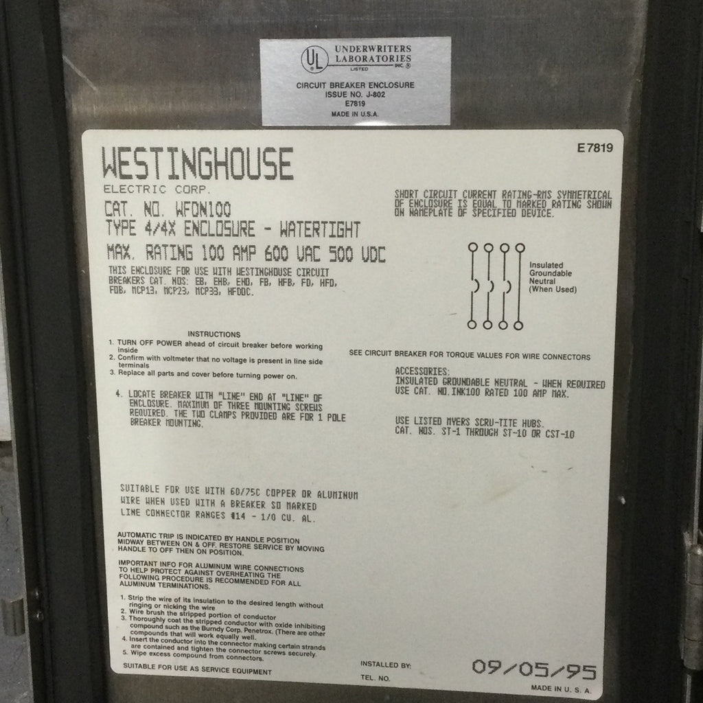 Westinghouse WFDN100 Type 4/4X Circuit Breaker Enclosure Stainless Steel