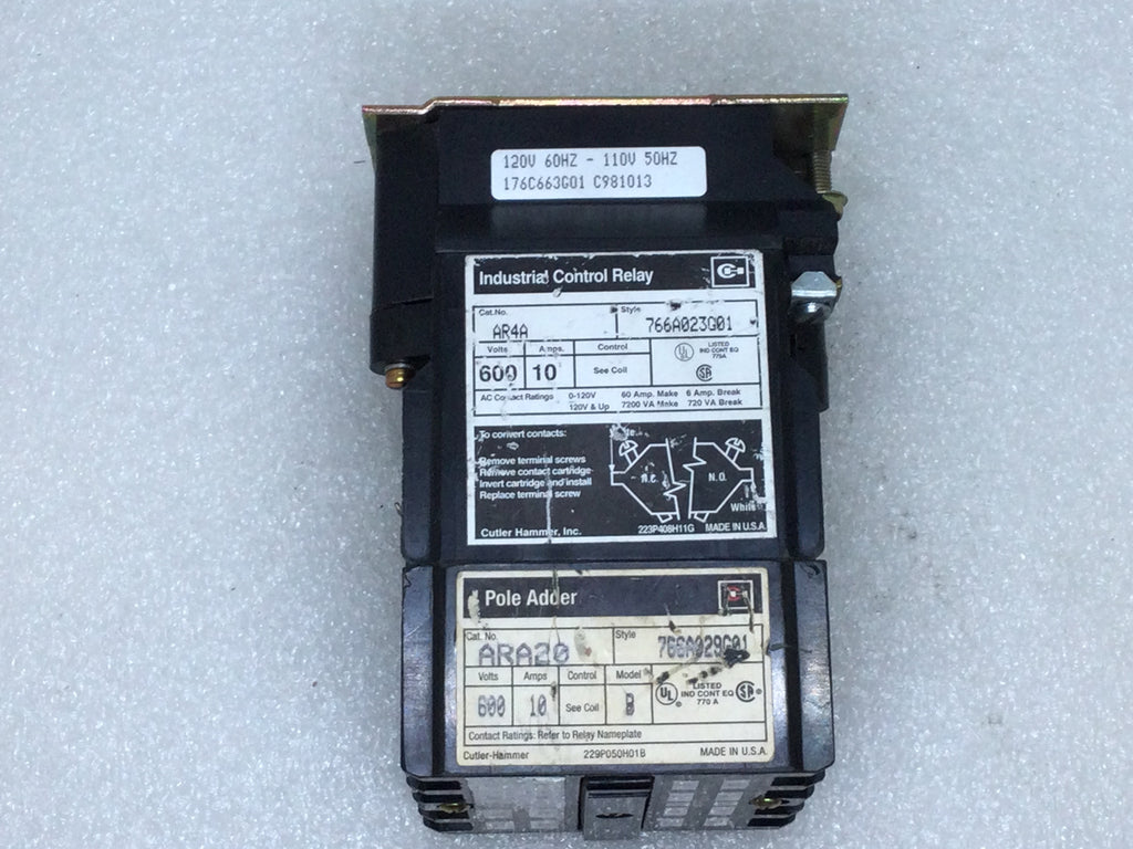 Cutler-Hammer 766A023G01/AR4A Industrial Control Relay 600V 10 Amp with 4-Pole Adder