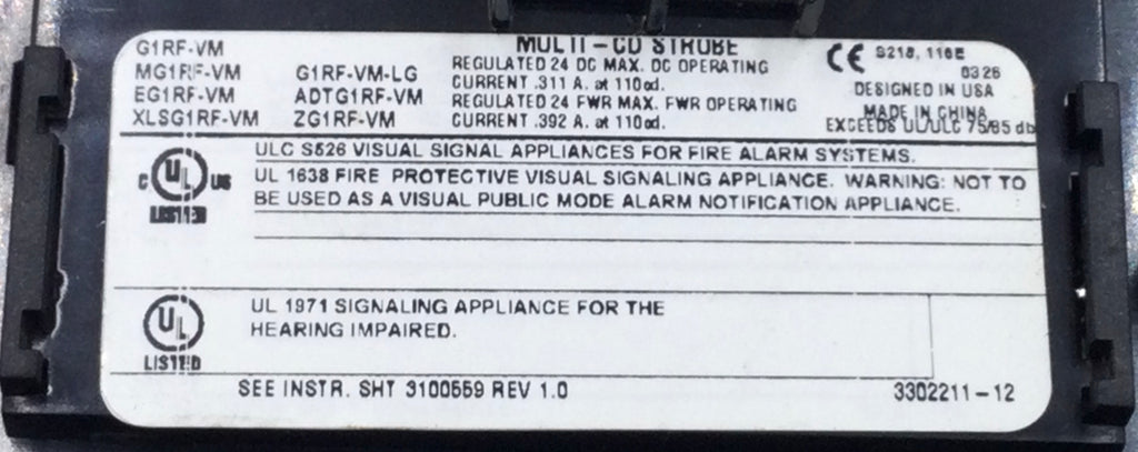 Edwards/EST G1RF-VM 24VDC/CC Multi-CD Strobe Horn Fire Panel/Alarm