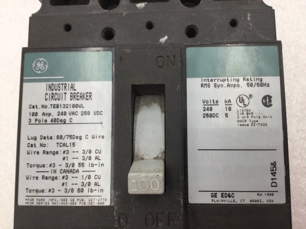 GE/General Electric TEB132100WL 100 Amp 3 Pole 240V Industrial Circuit Breaker