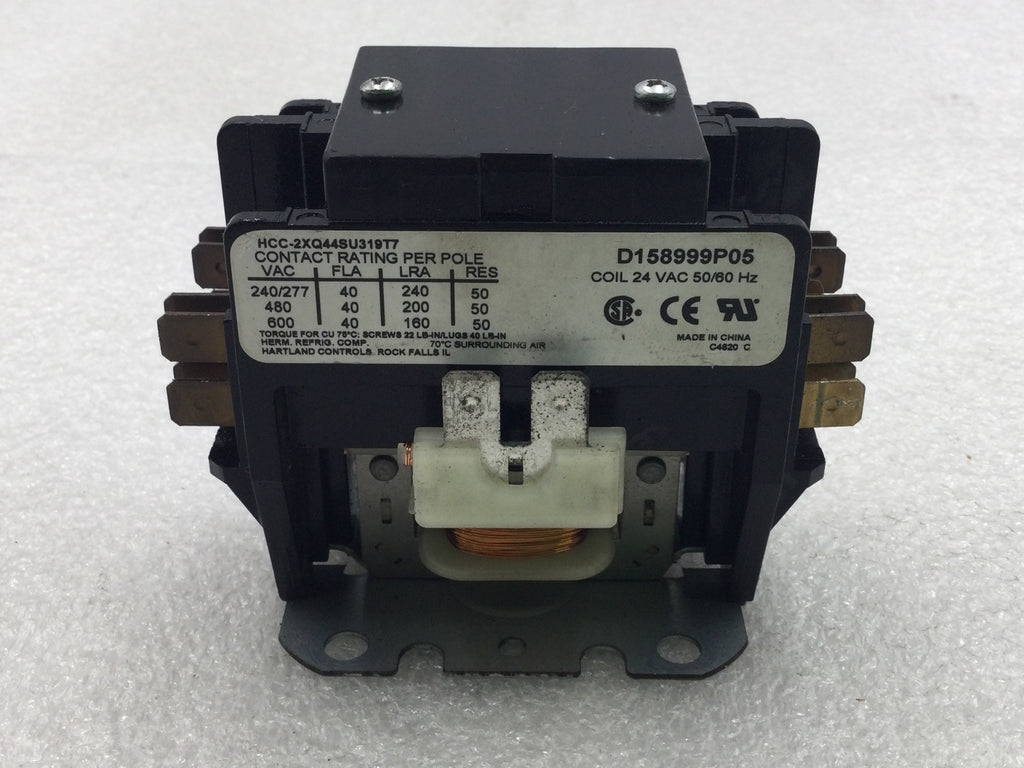 The Hartland Controls D158999P05 is a heavy-duty 2-pole contactor rated for 40 amps at 600V, engineered for industrial switching applications. Features a 24VAC control coil for reliable electromagnetic operation in demanding electrical systems. This contactor delivers consistent performance in motor control circuits, HVAC systems, and power distribution panels.