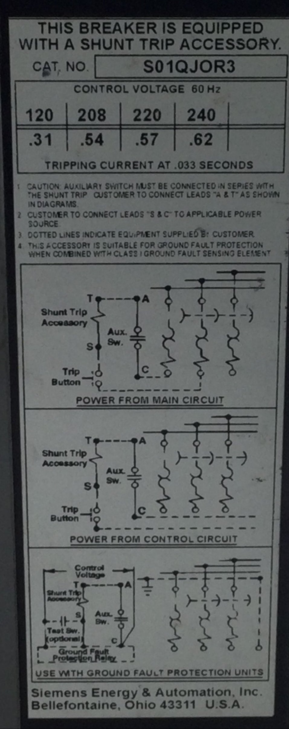 • Type: QJH Circuit Breaker w/S01QJOR3 Shunt Trip