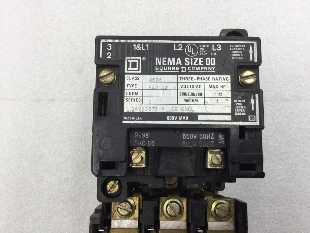 Square D 8536SAG12 3 Pole 200/230/380VAC @ 1 1/2HP 460/575VAC @ 2Hp Motor Starter with 600 VAC Coil
