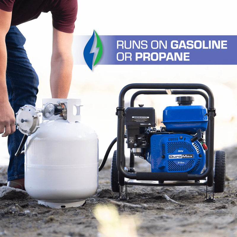 DuroMax Dual Fuel Water Pumps are the ultimate choice when choosing a semi-trash pump for quickly transferring water or de-watering flooded areas. Featuring a powerful DuroMax 212cc engine that can be fueled by either standard gas or liquid propane, this workhorse can power through a tough day’s work. The XP650WX can pump 264 gallons of water per minute and tackle solids or debris up to ¼” in diameter, making easy work of jobsites or farm/agricultural applications. This water pump utilizes professional grade components such as a cast iron impeller, volute and heavy-duty seals, and is backed by a manufacturer’s 3-Year Warranty.
