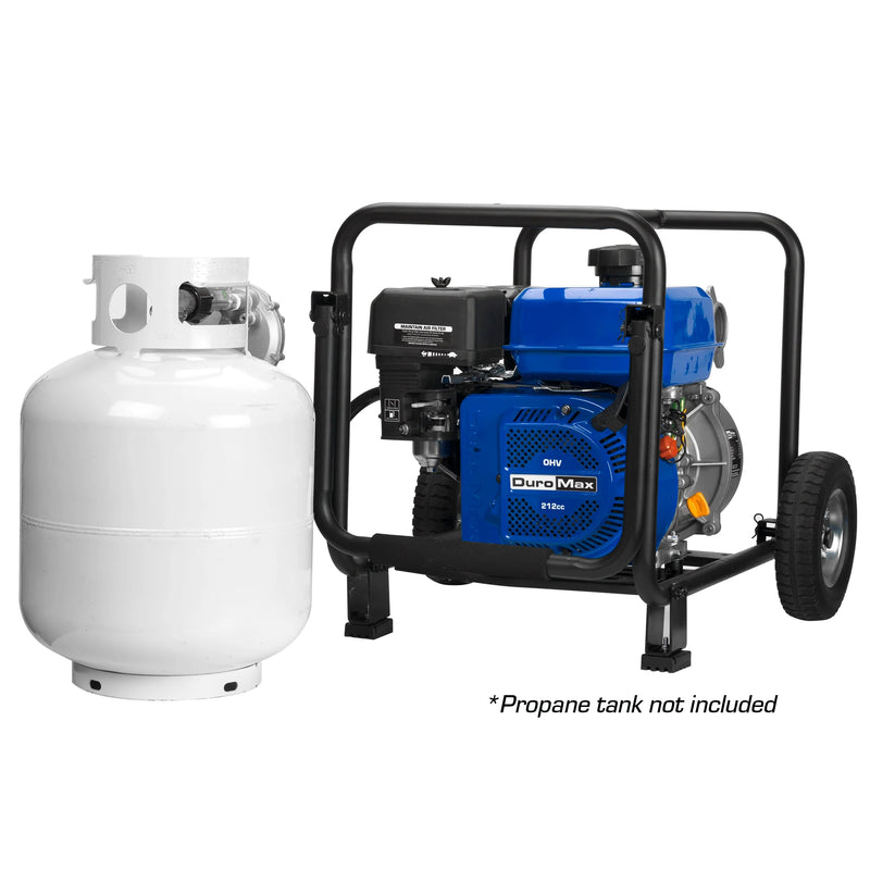DuroMax Dual Fuel Water Pumps are the ultimate choice when choosing a semi-trash pump for quickly transferring water or de-watering flooded areas. Featuring a powerful DuroMax 212cc engine that can be fueled by either standard gas or liquid propane, this workhorse can power through a tough day’s work. The XP652WX can pump 158 gallons of water per minute and tackle solids or debris up to ¼” in diameter, making easy work of jobsites or farm/agricultural applications. This water pump utilizes professional grade components such as a cast iron impeller, volute and heavy-duty seals, and is backed by a manufacturer’s 3-Year Warranty.