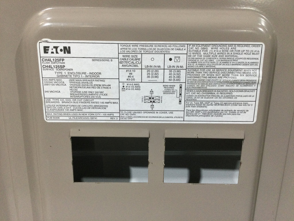 Cutler Hammer CH4L125FP 125 Amp CH Series Main Lug Only Load Center 1 Phase 3 Wire Nema 1 Indoor Enclosure 120/240v 14.25" x 12.25"