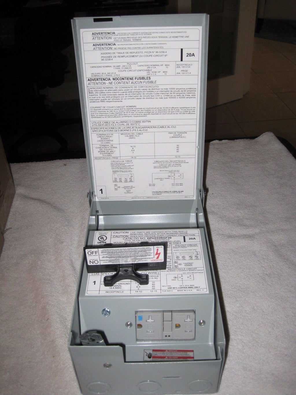 Eaton / Cutler Hammer DPU222RGF20WRTR Ground Fault Receptacle Non-Fused Pullout; 120/240 Volt, 60 Amp, 2-Pole, 1 Phase OUTDOOR