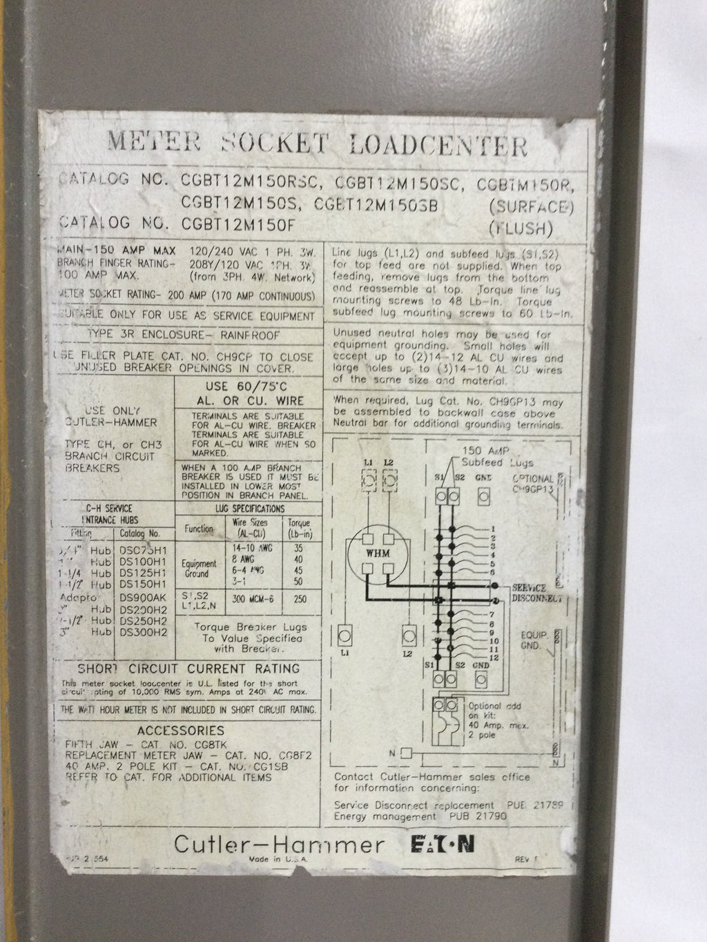 Eaton Cutler Hammer CGBT12M150S Nema 3R Cover/Door Only 150 Amp 120/240V 33 1/8" x 6 5/8"
