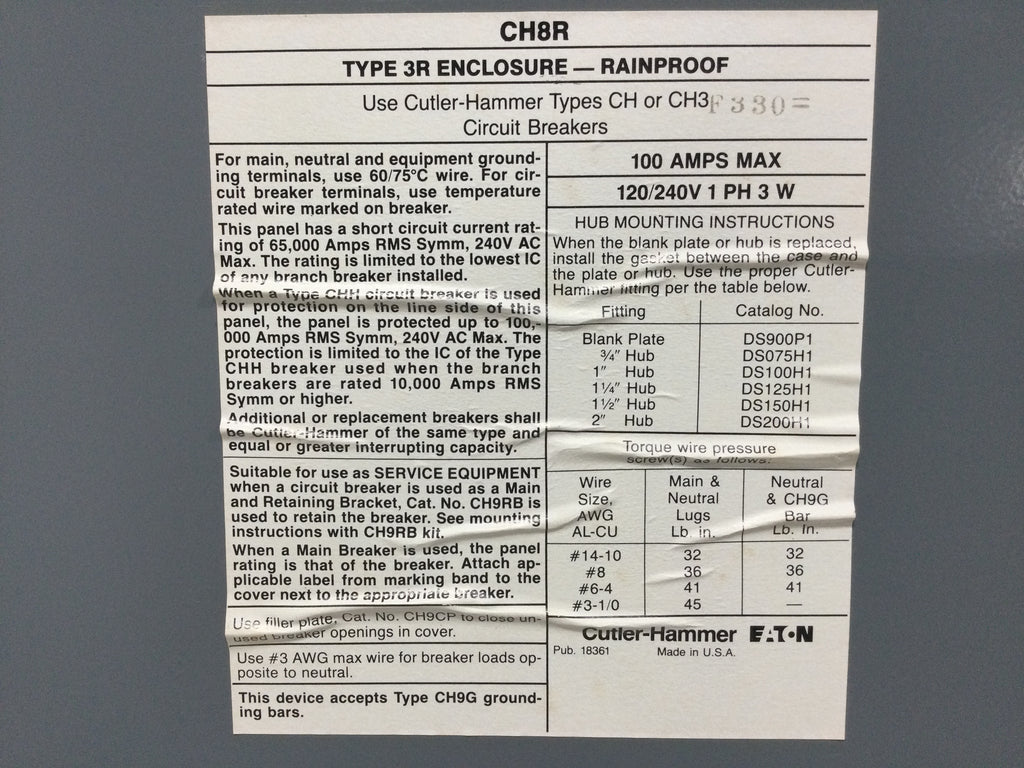 Eaton/Cutler-Hammer CH8R 16 Space, 100a, 120/240v, 1 Phase 3 Wire, Nema3r Enclosure B-9947 Panelboard