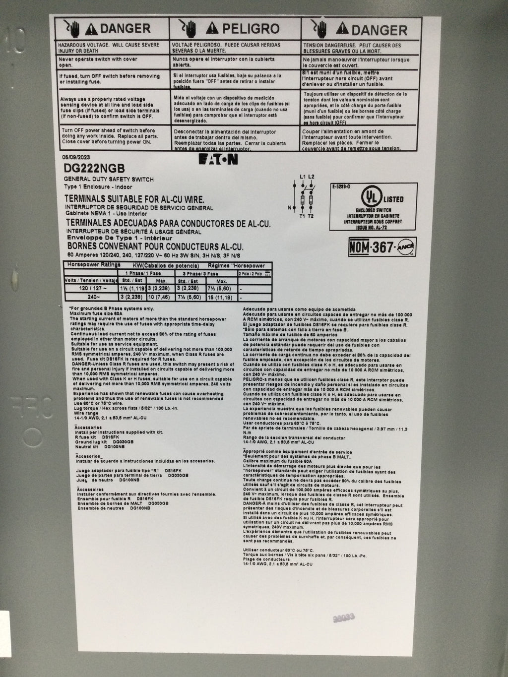 Eaton/Cutler-Hammer DG222NGB 60 Amp 240V Fusible Disconnect 14 1/4" x 9"