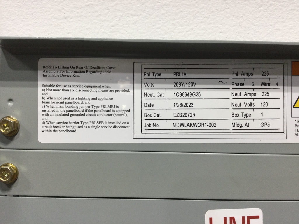 Eaton/Cutler-Hammer PRL1A 72 Space 208Y/120V 3Ph 225A Main Breaker Box No. EZB2072R
