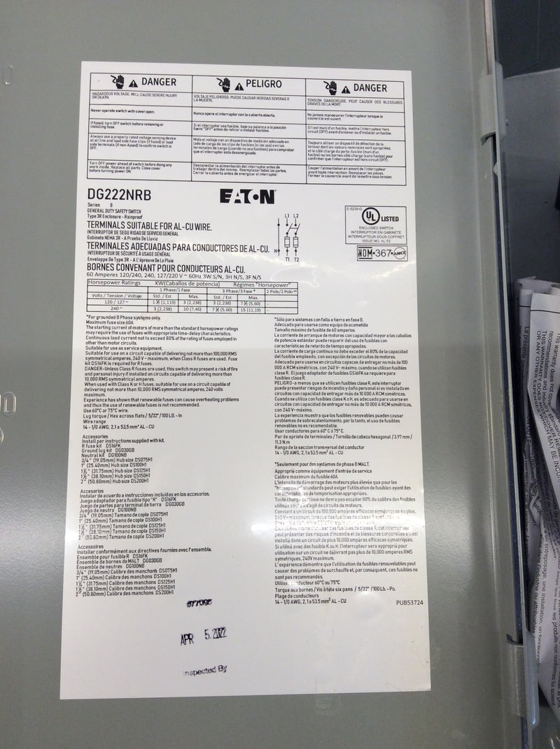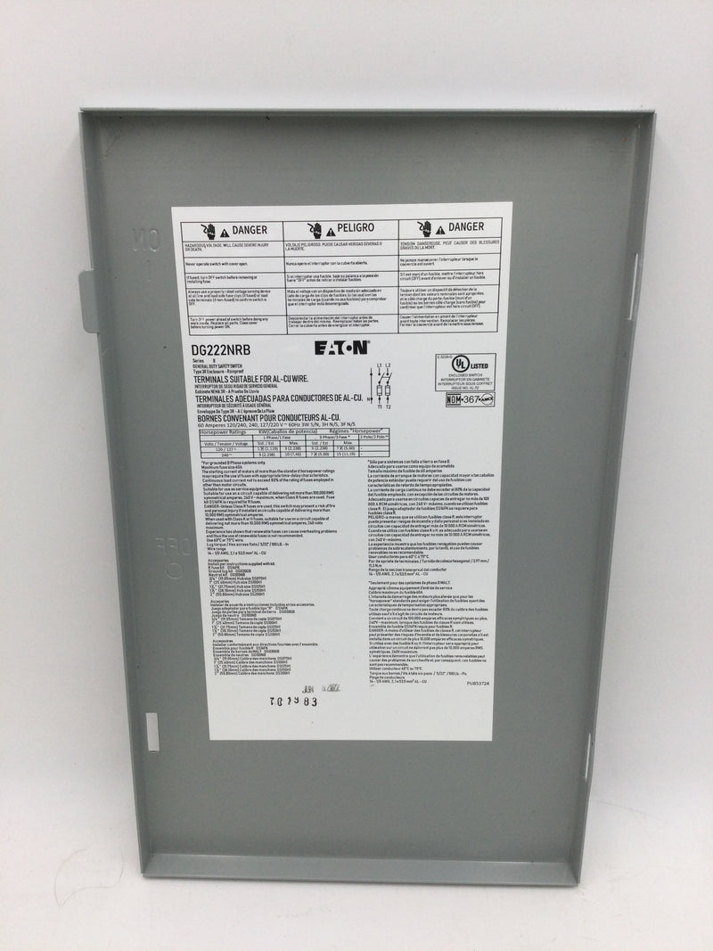 Eaton DG222NRB Single Phase 60A 240VAC Nema3R Fusible Safety Switch