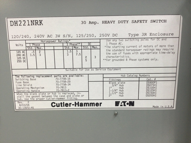 Eaton DH221NRK 30 Amp 2 Pole 240V Fusible Nema 3R Safety Switch