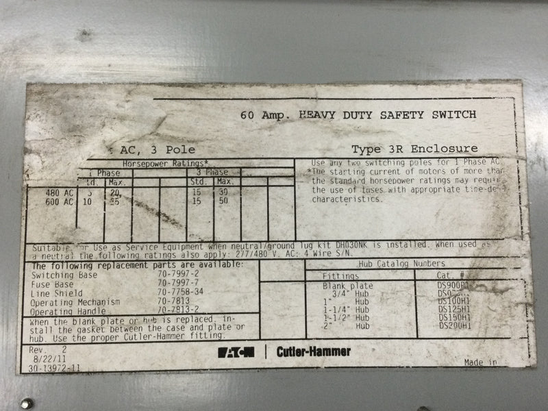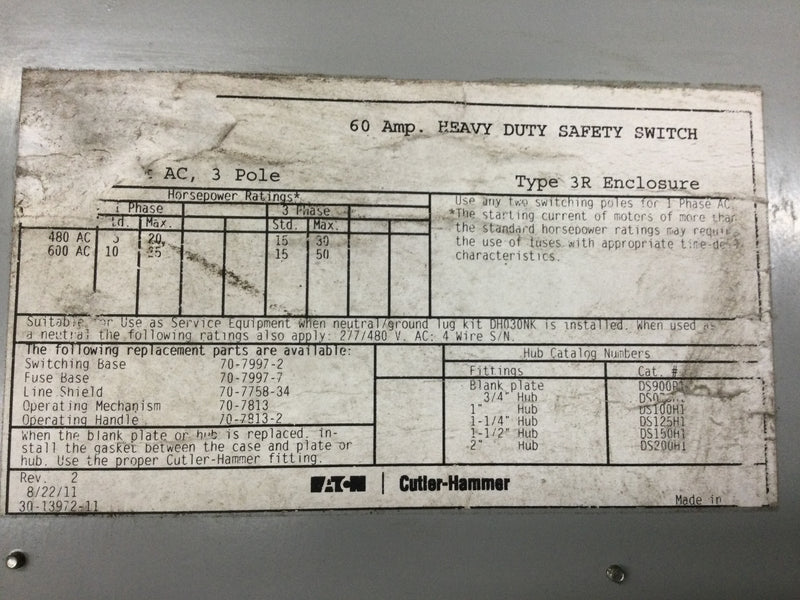 Eaton DH362NGK Heavy Duty Safety Switch 60 Amp 600 Vac 3 Pole