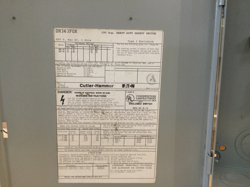 Eaton Dh363fgk 3 Wire 3 Pole Fusible K Series Heavy-Duty Safety Switch 600 Volt