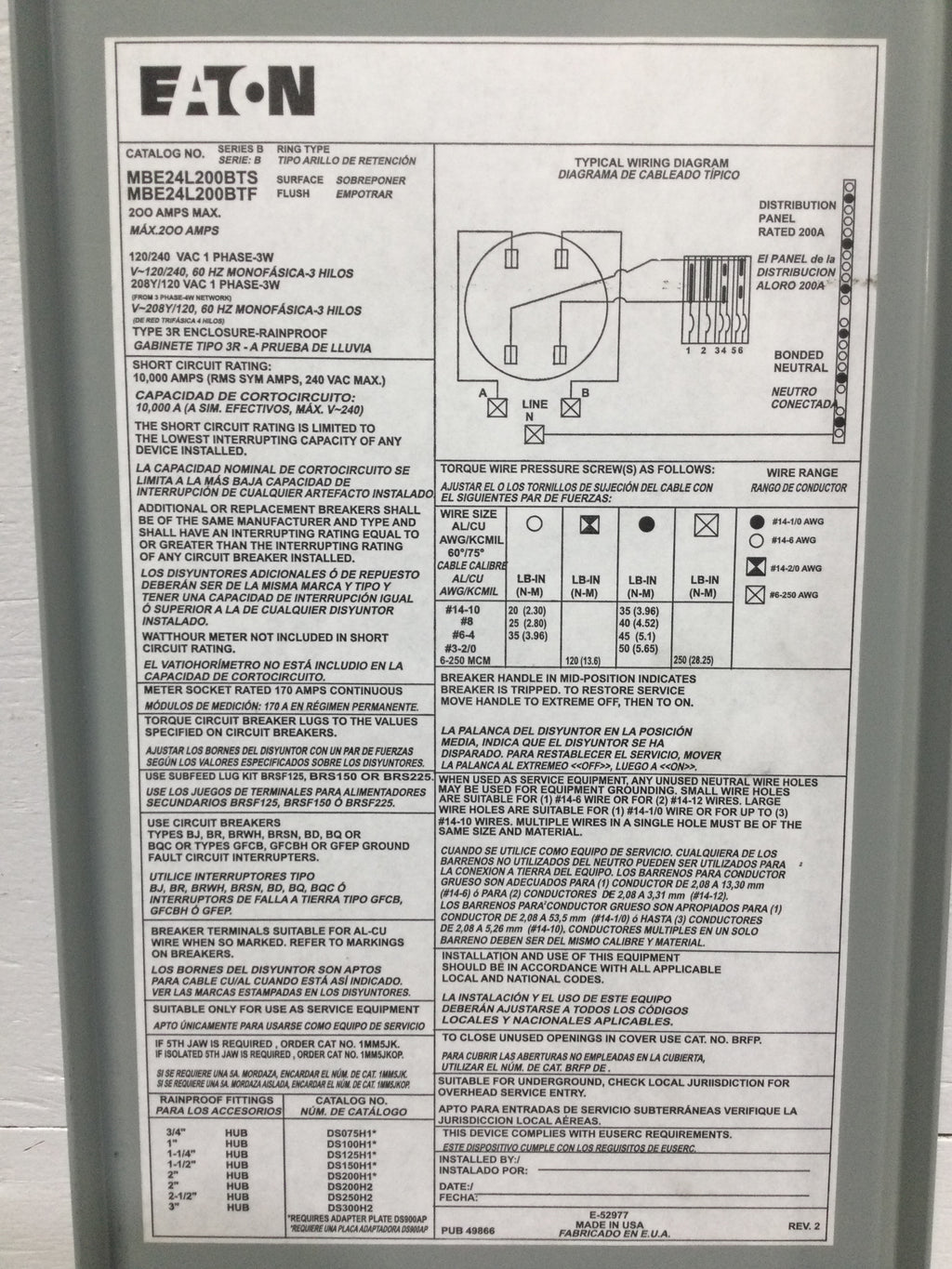 Eaton MBE24L200BTS 200 Amp 4 Space 120/240V Panel Cover Only 28" x 7"