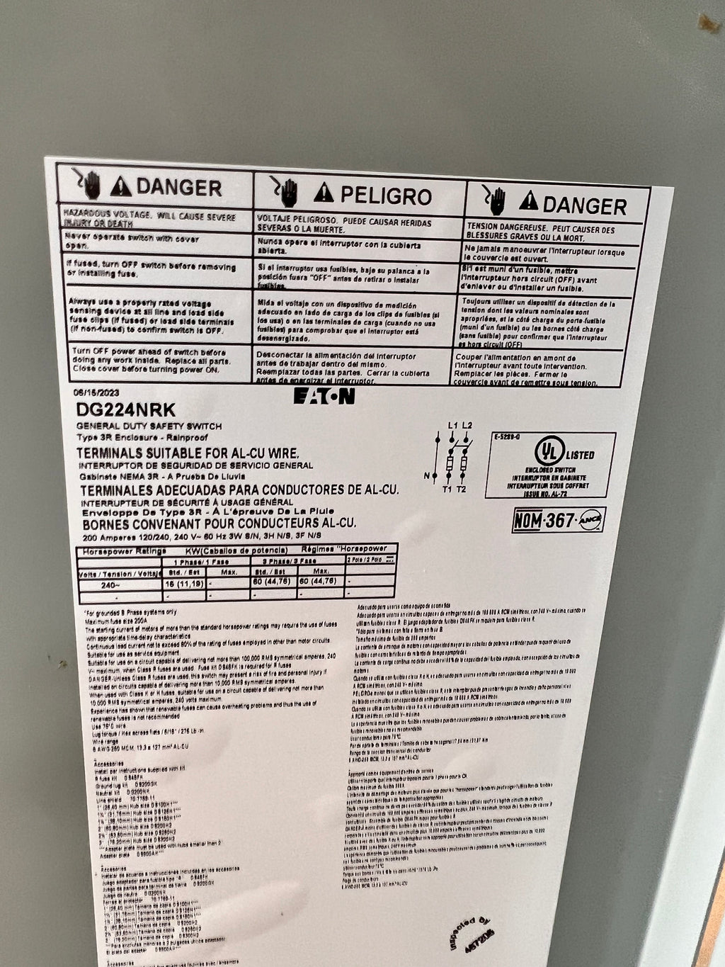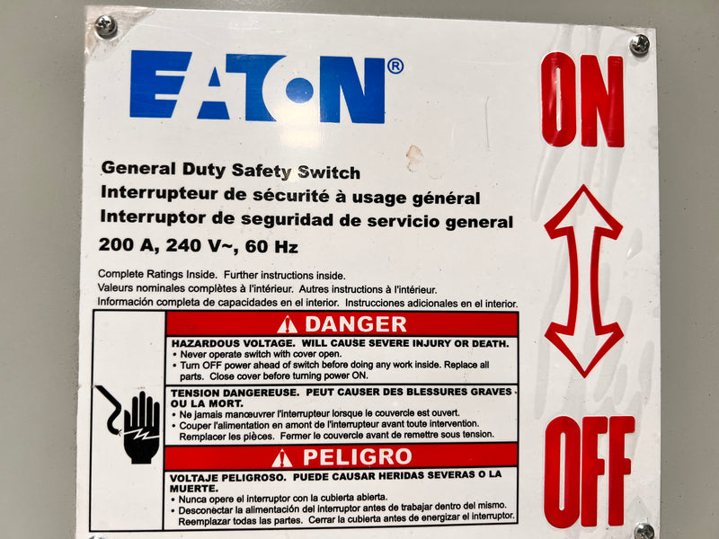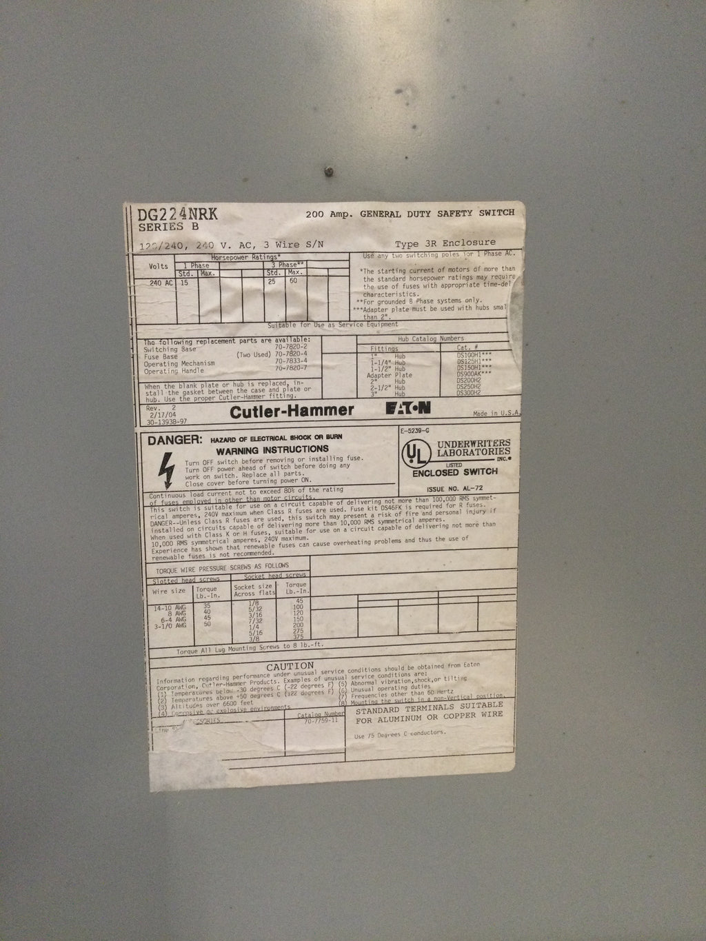 Eaton DG224NRK 200 Amp Single Phase 120/240V Nema3R Outdoor Fused Safety Switch