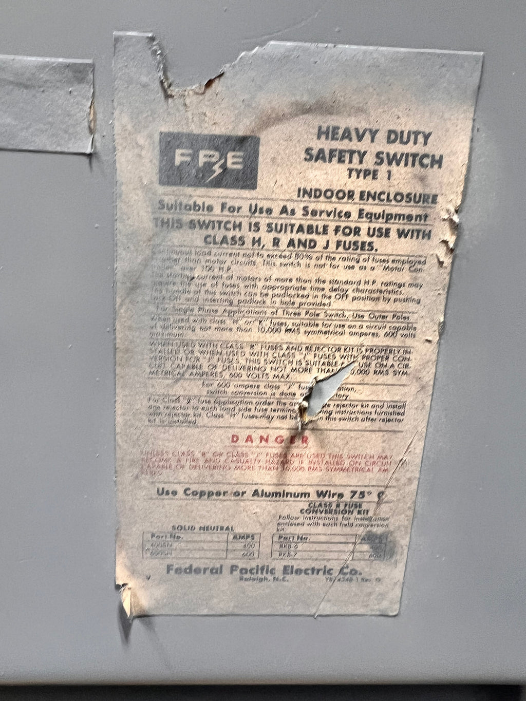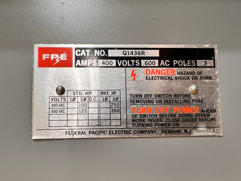 FPE Q1436R 400 Amp 600 V 3 Pole Fused Heavy Duty Safety Switch