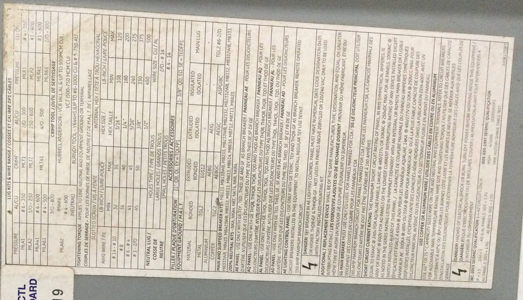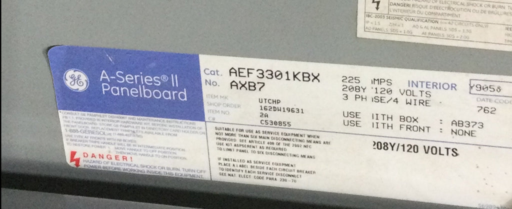 General Electric AEF3301KBX-AXB7 Main Breaker Panel 225A Max 208Y/120V Distribution Panel 42 Cir 3Phase 4 Wire 20" X 38"