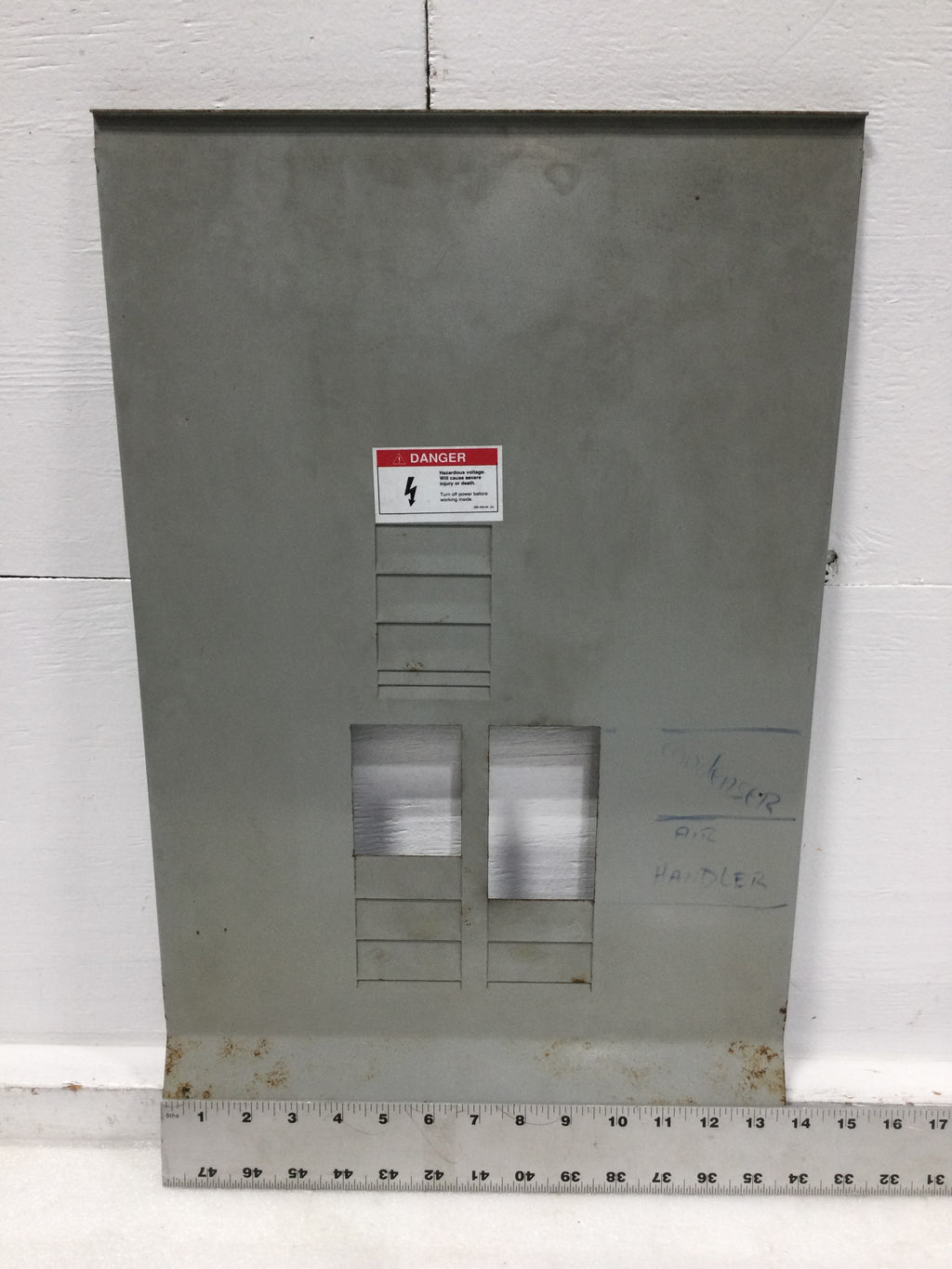 The General Electric 12 Space Dead Front panel, measuring 22 1/8" by 13 3/4", is designed for reliable electrical system protection and organization. This dead front cover provides a clean, safe barrier over the main breaker area, enhancing safety by preventing accidental contact with live components. Its precise dimensions ensure compatibility with standard 12-space breaker panels, making it an essential component for professional electrical installations and maintenance.