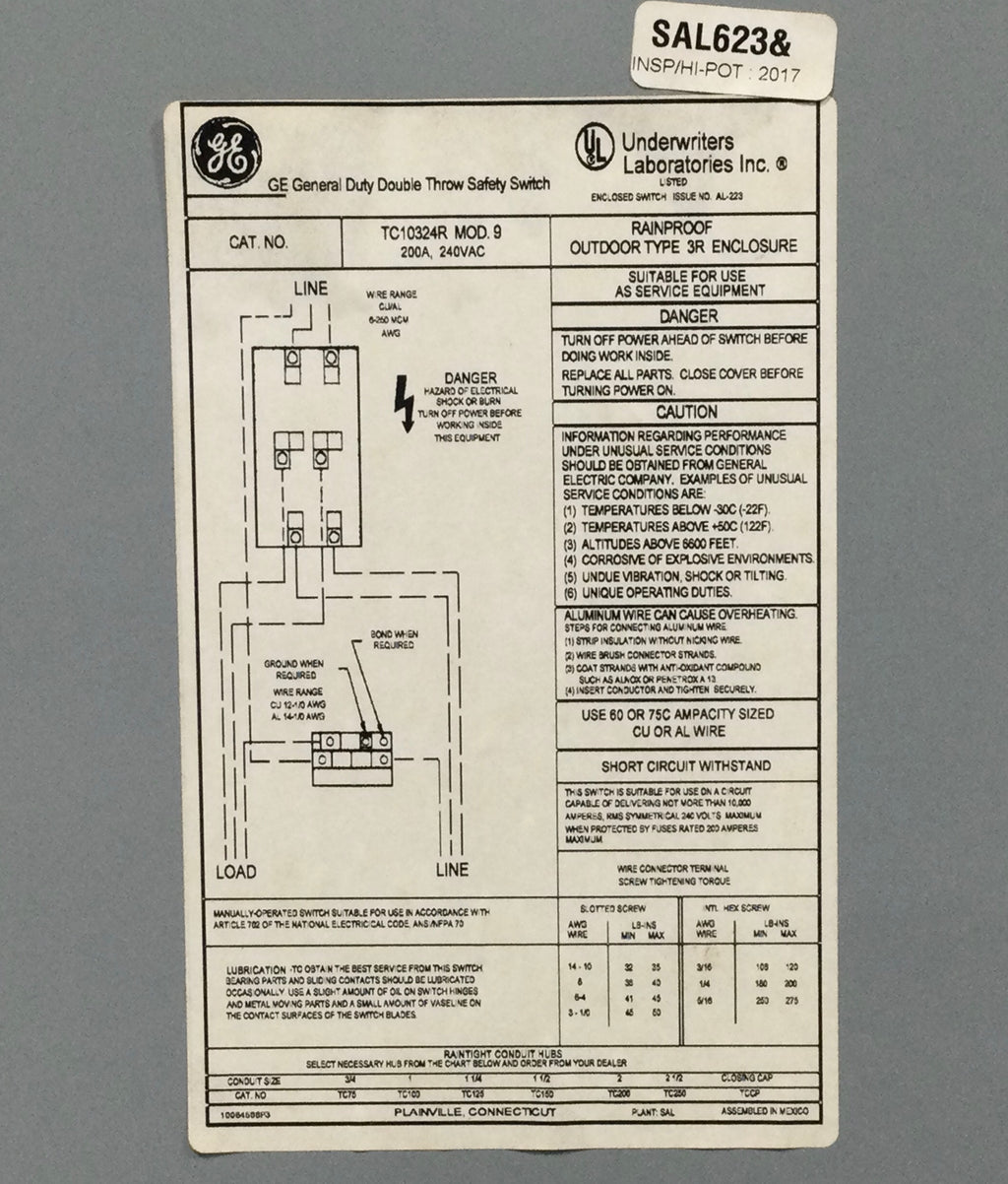 The General Electric TC10324R is a 200 Amp, 2 Pole, 240V non-fused safety switch designed for reliable electrical isolation. It provides a secure means to disconnect power for maintenance or emergency purposes without internal fuses, allowing for flexible circuit protection options.