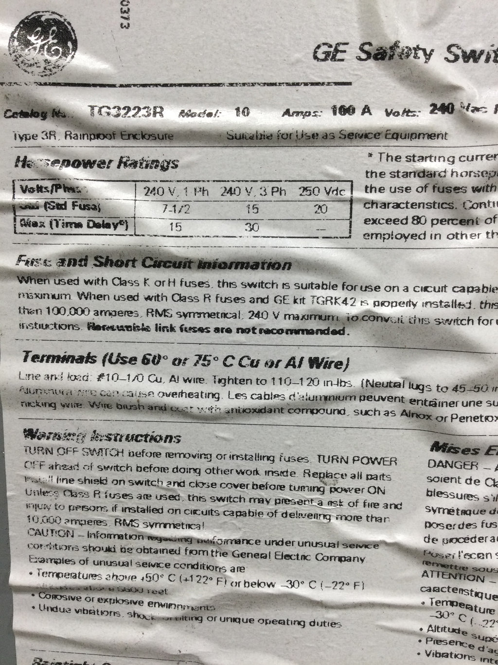 GE General Electric TG3223R Safety Switch Cover Only 100 Amp 240V Nema 3R 21" x 9 3/8"