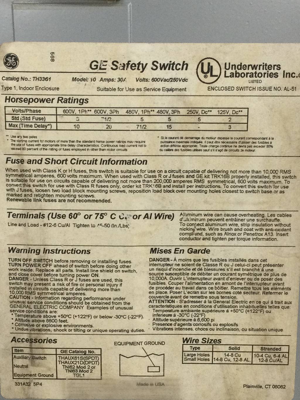 GE General Electric TH3361 Hinged Safety Switch Cover/Door Only