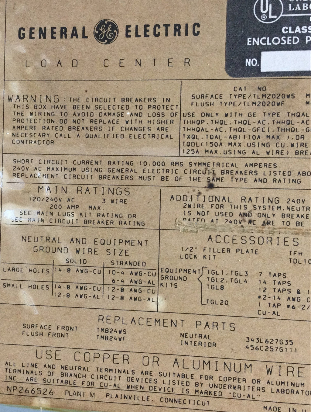 General Electric TLM2020WS replacement cover/door assembly designed for 40-space, 200-amp 240V electrical panels. Measures 27 1/8" x 14 3/8" to fit standard GE load centers. This OEM cover provides secure access to breaker switches while maintaining panel integrity and safety compliance.