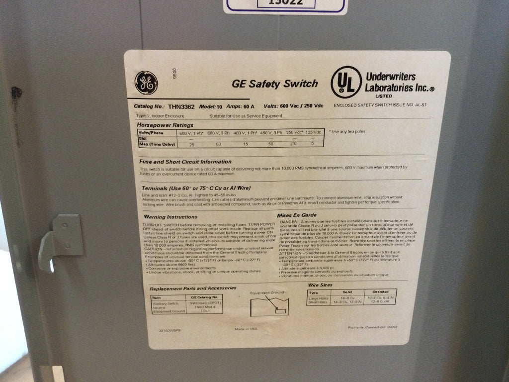 GE General Electric THN3362 60 Amp 600Vac 3 Pole Non Fused Nema 1 Safety Switch MOD 10
